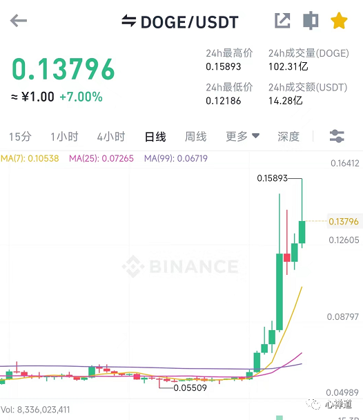 马斯克发推带货doge了(最强的带货就是发个图,好像啥也没说,好像又啥都说了,一切尽在不言中,聪明的人马上就get到并行动起来了),doge又从0.121拉到0.1589美金了,并带动了一波土狗