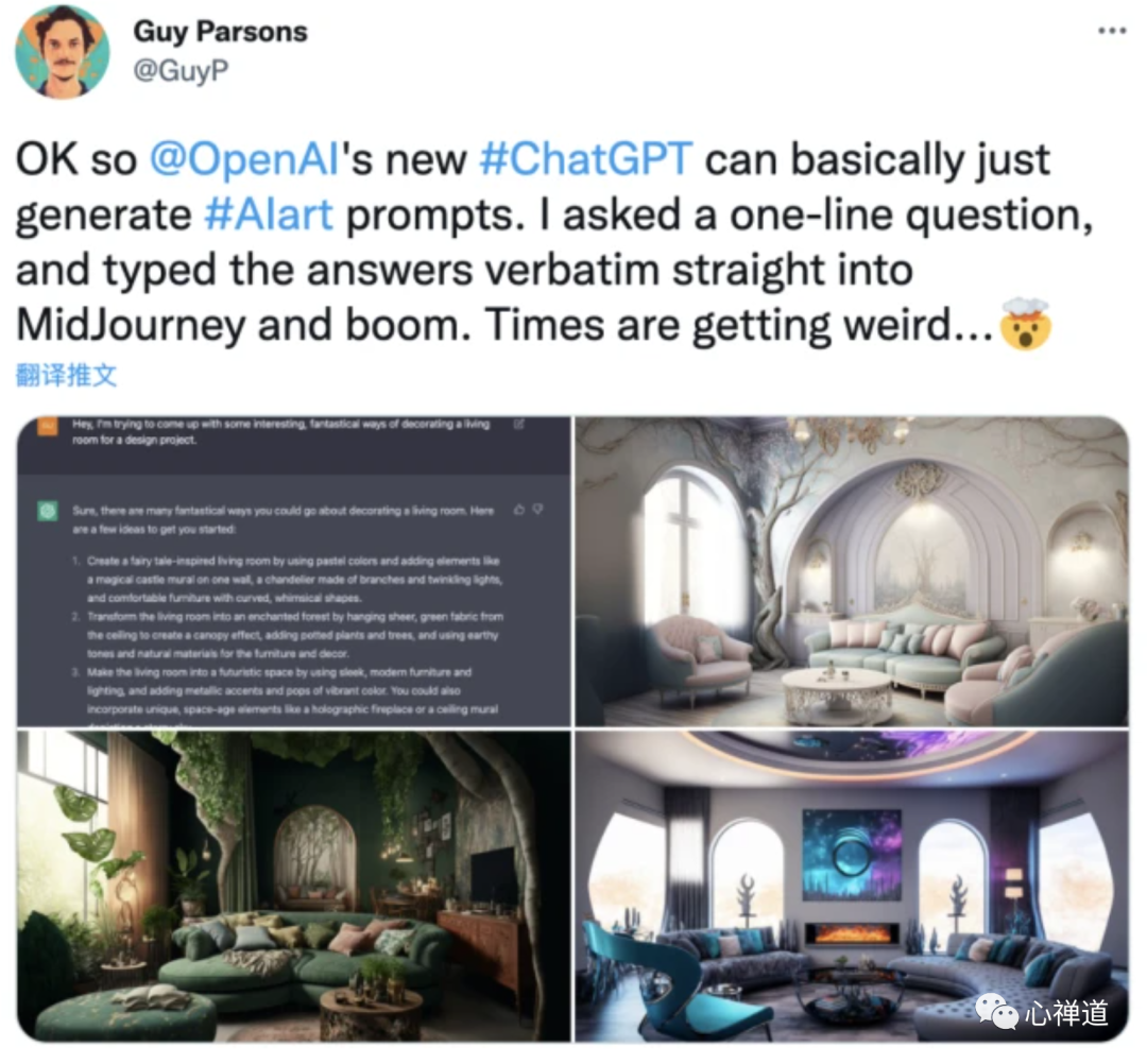 ChatGPT 虽是一个对话式的语言模型,它本身不能生成多模态内容,但我们可以把它看作一个中间模型,比如把 ChatGPT 和 Stable Diffusion 结合使用。