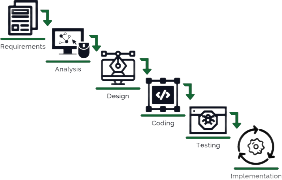 然而,GATE的打开和关闭仍旧是由人来判断的,人的能力和知识储备水平是不一样的。往往会发生过了GATE,但是其中需要排查的风险并未发现出来。流程本身也不能保证工作内容的质量符合预期。最严重的痛点是,每个阶段需要很长的时间收集整理处理信息,整个项目的时间周期会拉的非常长,从而引入更多的不确定性。人们也常常把这种方法论称作瀑布式的开发方式,见下方图例为一软件开发相关的通用步骤。