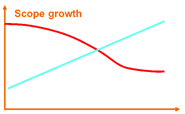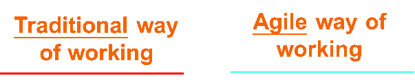 介绍了那么多,敏捷的优势到底在哪里呢?通过以下两个图,粗略的对敏捷开发和传统的瀑布式开发做一个对比,图中红色曲线是传统的工作方式,蓝绿色代表的是敏捷的工作方式,横轴是时间线,纵轴相对关系的比较示意,没有绝对的数值。