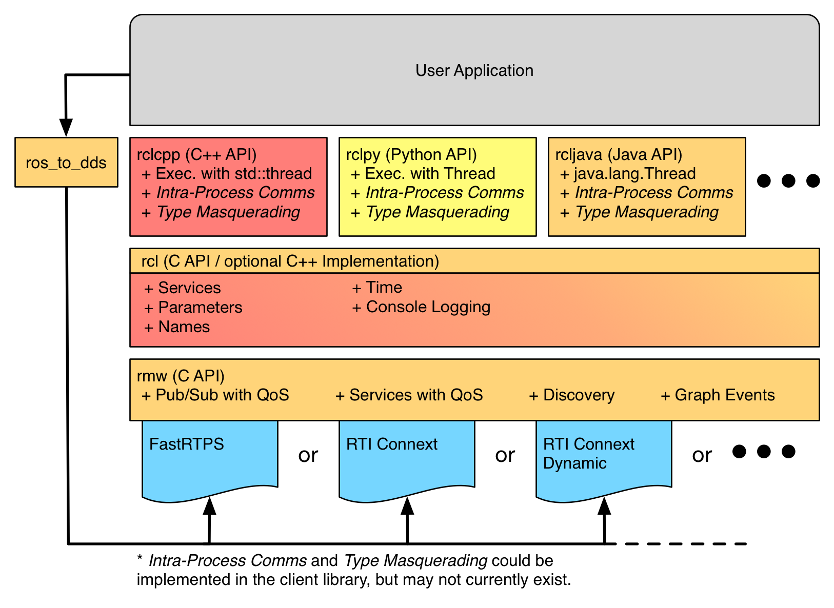 ROS 2则完全支持Python 3,并基于现代C++编写。并基于其松耦合的方式,还支持Java和Rust等编程语言。如下图User Application下面那一行所示,只要开发者愿意,可以支持任何编程语言。
