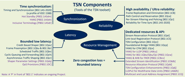 当前已经发布的 TSN 系列规范大致分为四个部分:时间同步、调度延时、可靠性、资源管理。
