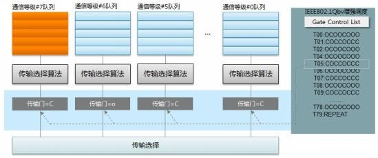 802.1Qbv 是在交换机多个输出队列的严格优先级(报文中的优先级通常来自于 VLAN 或者 IP)模式下,利用门循环列表 GCL(Gate Control List)来控制每个队列的开关时间窗口,来实现时间感知整形器TAS(Time-aware Shaper)的功能;GCL 通常有 8~16 组,可通过灵活配置来实现不同延时需求的调度规则集合,进而对应不同优先级帧的最大传输延时保证来实现传输延时确定性和带宽的稳定性。