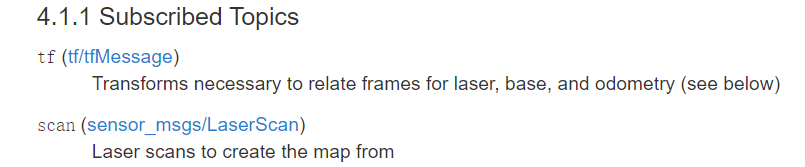 首先,我们在他的官方文档中可以看到,gmapping功能包订阅了 tf 和 scan,这个tf包括了odom和base_link的变换以及激光雷达和base_link的变换,在之前的文章里为我们介绍了前者,那么接下来将介绍后者的配置。