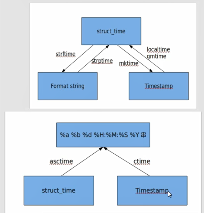 1 import time 2 3 timestamp = time.time() 4 print('时间戳', timestamp) # 时间戳 5 '''时间戳 1612952912.3360302''' 6 7 struct_time = time.localtime() 8 print('结构化时间', struct_time) # 结构化时间 9 '''结构化时间 time.struct_time(tm_year=2021, tm_mon=2, tm_mday=10, tm_hour=18, tm_min=28, tm_sec=32, tm_wday=2, tm_yday=41, tm_isdst=0) 10 ''' 11 12 # 时间戳转成结构化时间,以下两种方式作用类似 13 print('时间戳--->>结构化时间(1):\n', time.localtime(timestamp)) 14 print('时间戳--->>结构化时间(2):\n', time.gmtime(1572950584)) 15 ''' 16 时间戳--->>结构化时间(1): 17 time.struct_time(tm_year=2021, tm_mon=2, tm_mday=10, tm_hour=18, tm_min=28, tm_sec=32, tm_wday=2, tm_yday=41, tm_isdst=0) 18 时间戳--->>结构化时间(2): 19 time.struct_time(tm_year=2019, tm_mon=11, tm_mday=5, tm_hour=10, tm_min=43, tm_sec=4, tm_wday=1, tm_yday=309, tm_isdst=0) 20 ''' 21 22 # 结构化时间转化成时间戳 23 print('结构化时间--->>成时间戳:', time.mktime(struct_time)) 24 '''结构化时间--->>成时间戳: 1612952912.0''' 25 26 # 结构化时间转成字符串时间 27 timeformat = '%Y-%m-%d %H:%M:%S' 28 timeformat1 = '%Y-%m-%d %X' 29 print('结构化时间--->>字符串时间', time.strftime(timeformat, struct_time)) 30 '''结构化时间--->>字符串时间 2021-02-10 18:28:32''' 31 32 # 字符串时间--->>结构化时间,注意时间格式一定要对的上,否则报错 33 strtime = '2021-02-10 18:15:28' 34 print('字符串时间--->>结构化时间', time.strptime(strtime, timeformat)) 35 '''字符串时间--->>结构化时间 time.struct_time(tm_year=2021, tm_mon=2, tm_mday=10, tm_hour=18, tm_min=15, tm_sec=28, tm_wday=2, tm_yday=41, tm_isdst=-1) 36 ''' 37 38 39 print('快速显示时间(1):', time.asctime()) 40 print('快速显示时间(2):', time.ctime()) 41 '''快速显示时间(1): Wed Feb 10 18:45:04 2021 42 快速显示时间(2): Wed Feb 10 18:45:04 2021 43 '''