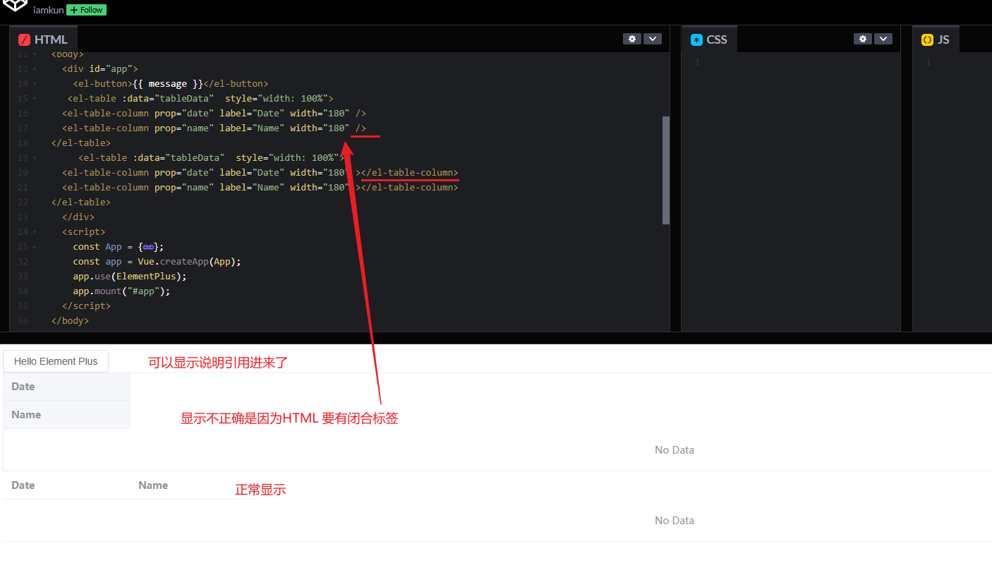<html> <head> <meta charset="UTF-8" /> <meta name="viewport" content="width=device-width,initial-scale=1.0" /> <script src="https://unpkg.com/vue@3"></script> <!-- import CSS --> <link rel="stylesheet" href="https://unpkg.com/element-plus/dist/index.css"> <!-- import JavaScript --> <script src="https://unpkg.com/element-plus"></script> <title>Element Plus demo</title> </head> <body> <div id="app"> <el-button>{{ message }}</el-button> <el-table :data="tableData" style="width: 100%"> <el-table-column prop="date" label="Date" width="180" /> <el-table-column prop="name" label="Name" width="180" /> </el-table> <el-table :data="tableData" style="width: 100%"> <el-table-column prop="date" label="Date" width="180" ></el-table-column> <el-table-column prop="name" label="Name" width="180" ></el-table-column> </el-table> </div> <script> const App = { data() { return { message: "Hello Element Plus", }; }, }; const app = Vue.createApp(App); app.use(ElementPlus); app.mount("#app"); </script> </body> </html>
