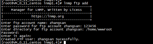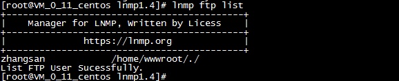 按提示分别输入要创建的ftp账号、密码以及ftp账号对应的目录(目录必须是以/开始的绝对目录),提示已经创建成功,可以输入lnmp ftp list命令查看以下是否存在。如图:
