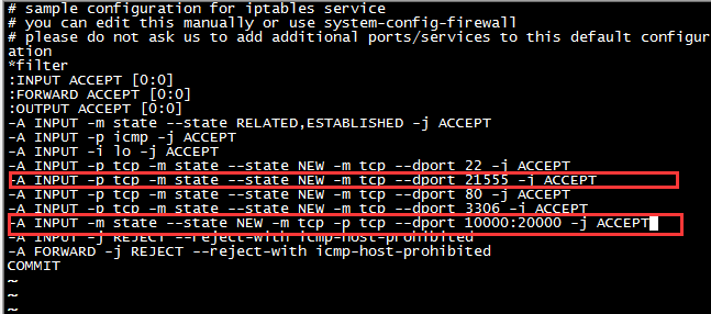 -A INPUT -p tcp -m state --state NEW -m tcp --dport 21555 -j ACCEPT -A INPUT -m state --state NEW -m tcp -p tcp --dport 10000:20000 -j ACCEPT