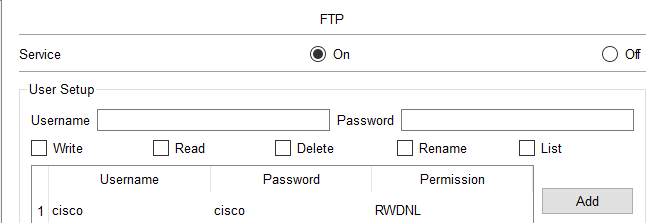 服务器的FTP协议默认开启(On),且有初始的用户名(cisco)和密码(cisco),也可自己重新设置,这里选择默认。