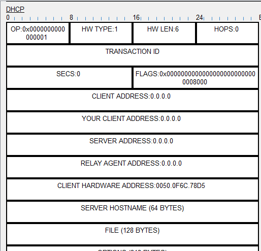 FLAGS:标志字段。这个16比特的字段,目前只有最左边的一个比特有用,该位为0,表示server以单播方式传播封包给client,为1表示以广播的方式传播给client;