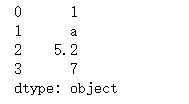 import pandas as pd s1 = pd.Series([1,'a',5.2,7]) print(s1)
