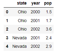 df = pd.DataFrame( { 'state':['Ohio','Ohio','Ohio','Nevada','Nevada'], 'year':[2000,2001,2002,2001,2002], 'pop':[1.5,1.7,3.6,2.4,2.9] } )
