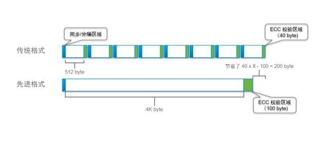 在传统格式中,每个扇区大小为 512 byte,在扇区的数据之间,需要间隔一个同步/分隔(Sync/DAM)区域和一个ECC 错误校验区域 (40 byte)。而在“先进格式化”模式下,每 4K byte 为一个扇区,相当于把之前的8个扇区合而为一,只需要一个同步/分隔区域和一个容量稍大的 ECC 校验区 (100 byte)。下图是传统格式和先进格式扇区的对比,从中可以看到,存储同样的 4K byte 数据,先进格式占用的面积明显更小,能够节省 200 byte 的磁道空间。4K byte 扇区对于磁道的利用率高达 97%,远远高于传统格式的 88%。