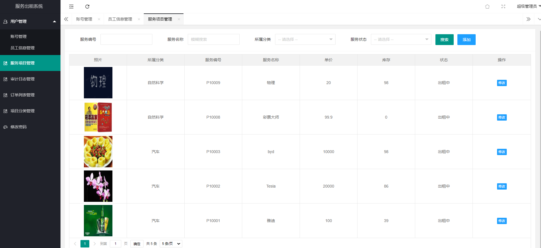 基层操作员可以通过在项目管理模块通过搜索项目名获取项目编号,随后到订单列表管理模块协助客户下单并写入客户的个人信息,下单完成后即可将服务借出。归还时可以通过搜索用户姓名或类别来找到操作记录,点击一键归还即可。系统在服务出库/入库时会自动在审计日志模块生成对应的时间记录。
