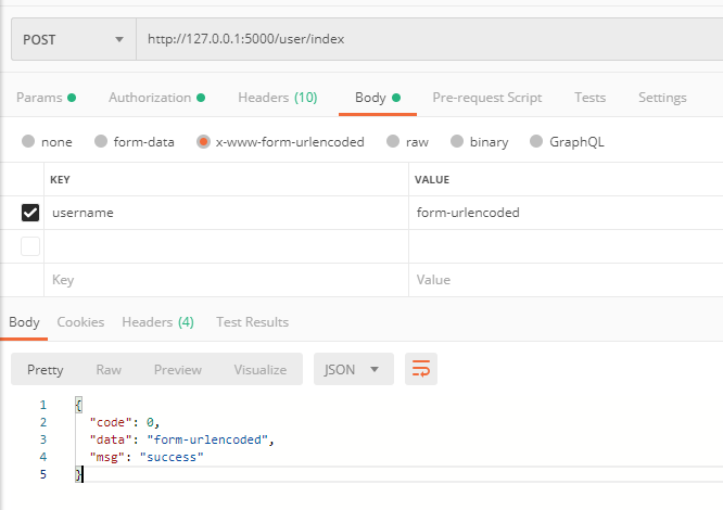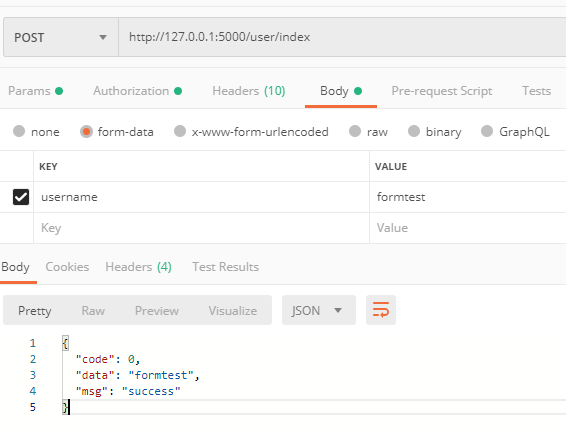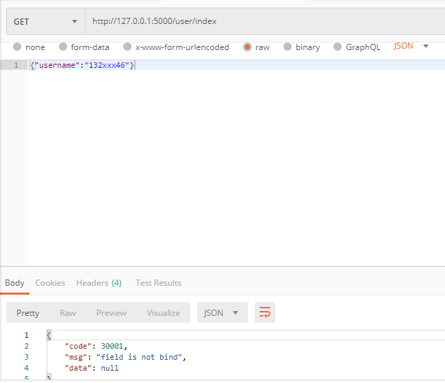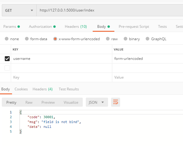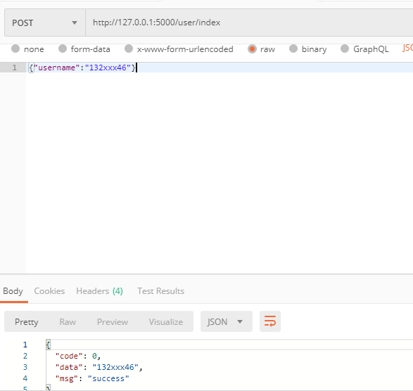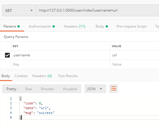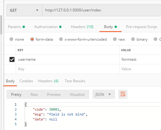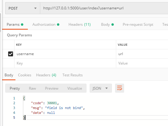 1 @user.route("/index",methods=["GET","POST"]) 2 def test(): 3 4 item = Testform() 5 if not item.validate_for_api(): 6 return item.bindErr # 如果不通过直接返回 7 8 return {"code":0,"msg":"success","data":item.username.data}