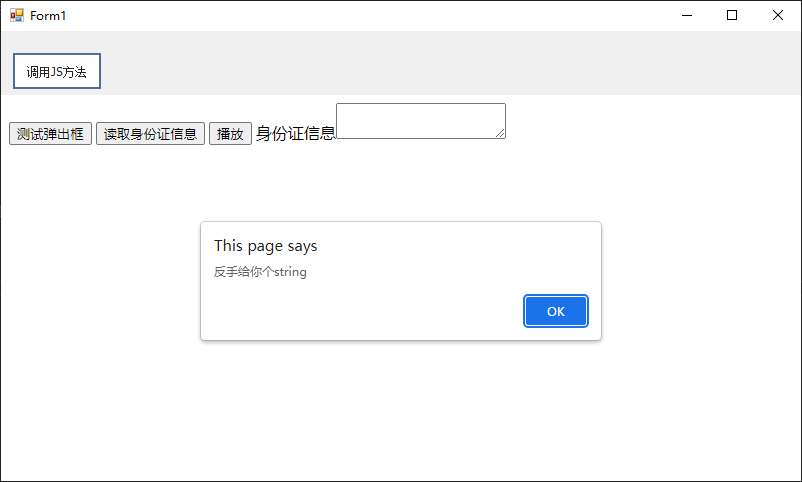 <!DOCTYPE html> <html style="overflow: hidden;"> <head> <title></title> <link type="text/css" href="../Content/css/framework-font.css" rel="stylesheet"> <!-- jQuery相关引用 --> <script type="text/javascript" src="https://cdn.staticfile.org/jquery/3.4.0/jquery.min.js"></script> <script type="text/javascript" src="https://cdn.staticfile.org/jquery-cookie/1.4.1/jquery.cookie.min.js"></script> </head> <body > <div> <button onclick="test1()">测试弹出框</button> <button onclick="test2()">读取身份证信息</button> <button id="btn_play">播放</button> 身份证信息<textarea id="idcardmsg"></textarea> </div> <script> function test1() { bound.showAlertMsg("我是来自HTML的消息"); } function test2() { var result = bound.readIdCard(); $("#idcardmsg").val(result); } function GetCef() { //控制台打印数据,验证一下 console.log(bound.getSrc()); return bound.getSrc(); } $(function () { $("#btn_play").click(function () { var txt = GetCef(); console.log("button.play---" + txt); alert(txt); }); }); </script> </body> </html>