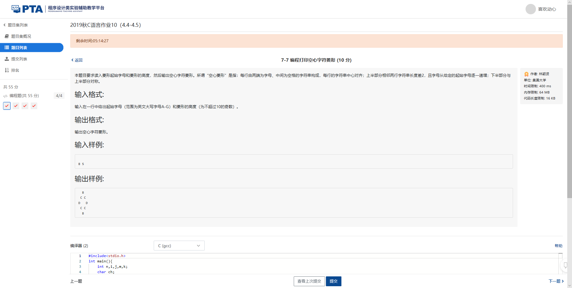 本题目要求读入菱形起始字母和菱形的高度,然后输出空心字符菱形。所谓“空心菱形”是指:每行由两端为字母、中间为空格的字符串构成,每行的字符串中心对齐;上半部分相邻两行字符串长度差2,且字母从给定的起始字母逐一递增;下半部分与上半部分对称。