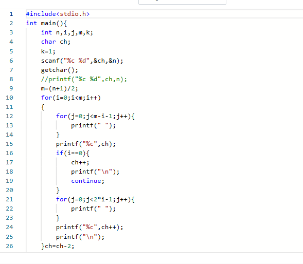 输入在一行中给出起始字母(范围为英文大写字母A-G)和菱形的高度(为不超过10的奇数)。