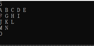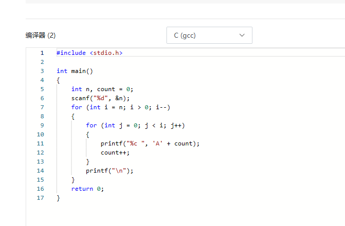 输出n行由大写字母A开始构成的三角形字符阵列。格式见输出样例,其中每个字母后面都有一个空格。