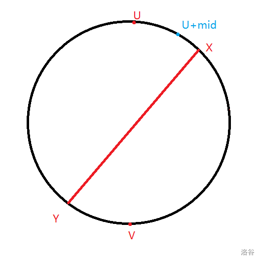 最终的 \(mid\) 表示弦的其中一个端点是 \(u+mid\)。