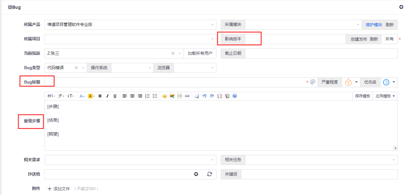 在创建Bug的时候,必填的字段是影响版本、Bug标题、重现步骤这些基本的信息。所属项目,相关产品,需求可以忽略。