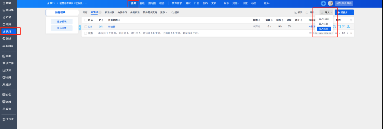 除了以上描述的任务工时管理,还有禅道用户问禅道有没有Bug预估工时功能。Bug是没有预估工时功能的,预估工时是执行-任务下的功能。可以通过“执行-任务-导入Bug”,将Bug转成执行中的一个任务管理,进行任务的工时预估。