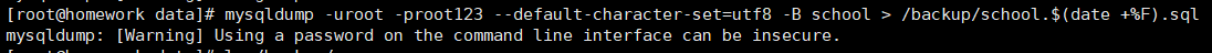 mysqldump -uroot -proot123 --default-character-set=utf8 -B school > /backup/school.$(date +%F).sql