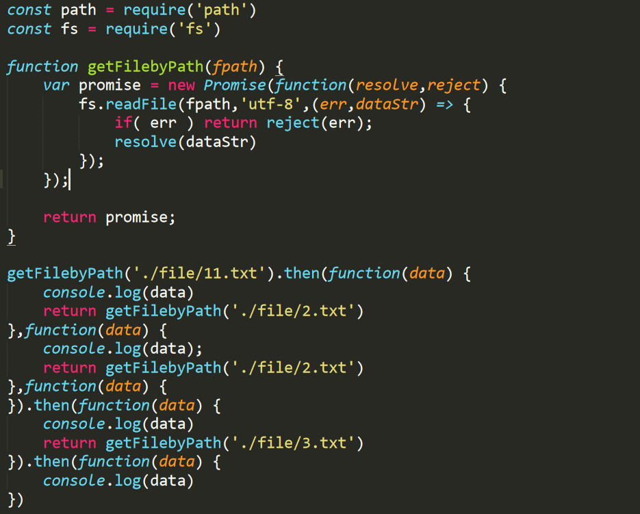 - getFilebyPath函数调用处使用.then()方法预先绑定resolve和reject方法