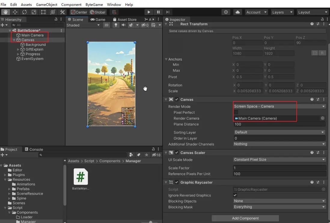 1. 选中 Canvas 后,Render Mode 选择 “Screen Space-Camera”,Hierachy 中的 Main Camera 拖入 Render Camera 中。