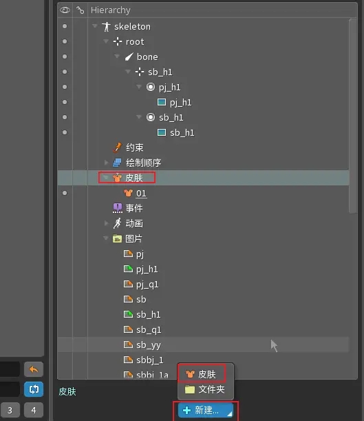 在层级树中选择一个皮肤,点击左边的 “眼睛(小圆点,表显示)”,然后选中某插槽下的一个附件(图片)。选择后再点击下面的 “新建” -> “皮肤占位符”。,名字自定。
