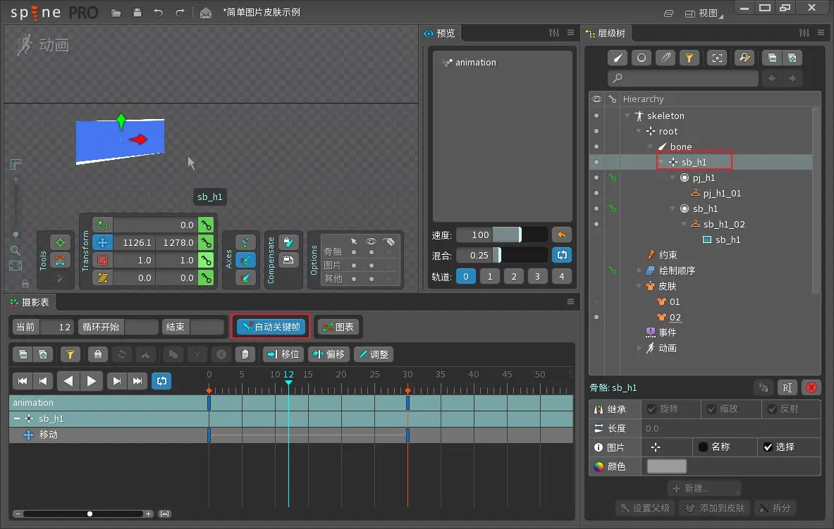 进入动画模式后,点击两张图片上的骨骼,在摄影表中给该骨骼添加移动的关键帧,最后我们在播放时就可以切换皮肤了。