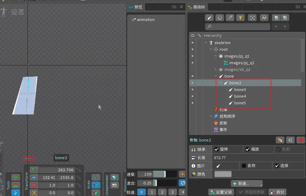 导入两张形状一致,但纹理不同的图片,然后两张图全部绑定在一个骨骼下,层级结构参考下图。