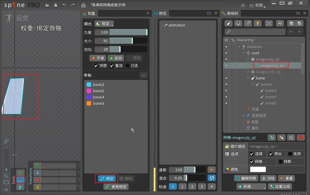 装配和上面图片的皮肤示例一样,但是在绑定骨骼前,现对图片网格处理(蒙皮),然后绑骨骼,刷权重。