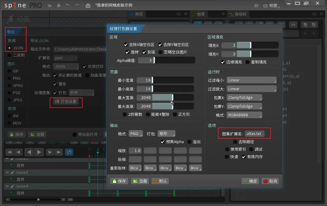 点击导出,选择 “JSON”,确定输出文件夹后,点击 “打包设置”,为了被 Unity3D 支持,图集扩展名要加上 “.txt”。