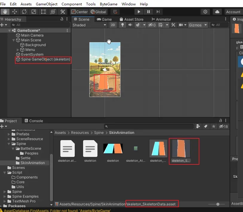 放入一个文件夹后直接复制到 Unity3D 项目的 Resources 后,游戏引擎会再生成一个 atlas 和 skeletonData 的 asset 文件,以及一个 mat 文件。