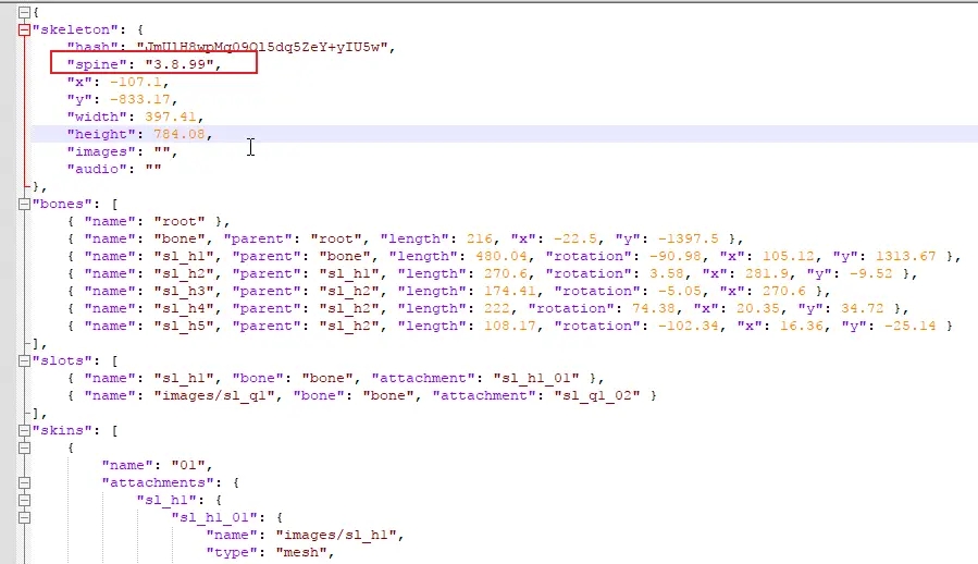 发现格式都差不多,唯一不同的只是 skeleton 下的 spine 版本号,原本的是 3.8.75,当我改成 3.8.99 重新加载进去后竟然就可以了。这整得我也是很无语,就只是校验了一下版本号,我还以为是格式不对。