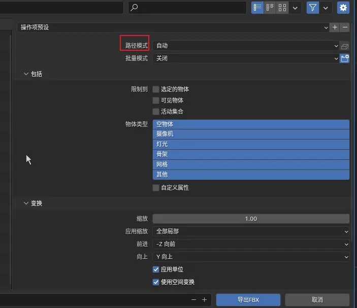 点击导出,选择 FBX,弹出的窗口,路径模式,如果是内嵌式纹理,要选择 “复制”,然后把右边的小图标打开,最后导出就可以了。