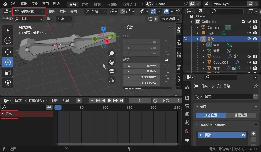 记得是在姿势模式下,然后在 Blender 底部把 “时间线” 拉高一点,折叠的 “汇总” 也点击展开来。