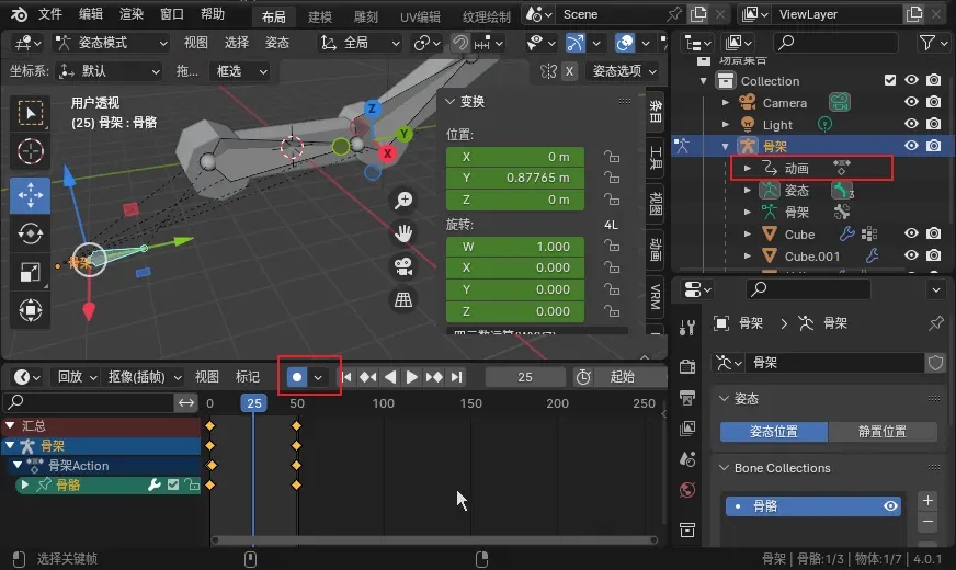 点亮 “自动插帧” 按钮,将关键帧放到 0 帧位置,开始对某个骨骼进行变换,旋转,移动等,然后再移动到指定关键帧位置再变换,播放一下就可以看到动画了。