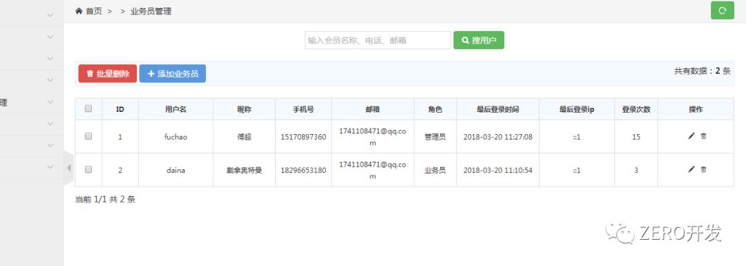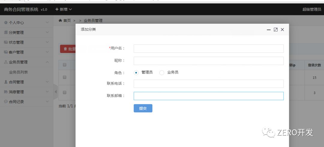2.业务员:(个人资料修改,只能看到自己负责的合同,添加,修改。搜索,短消息(可发送消息给其他管理员或业务员))