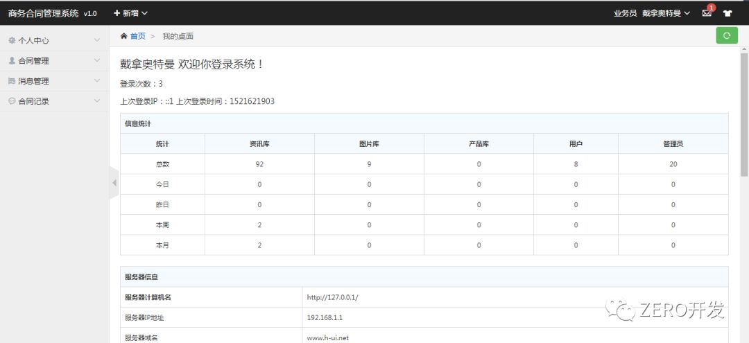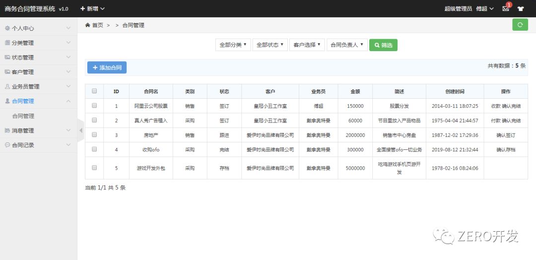 上面就是系统的基本功能,后期其实扩展还有很多,比如每次合同的状态发生改变,系统会给所有管理员发一条站内消息,业务人员只能看到自己负责的合同。也可以开发短信提醒功能,还可以加上绩效统计之类的功能,这就要看这些业务