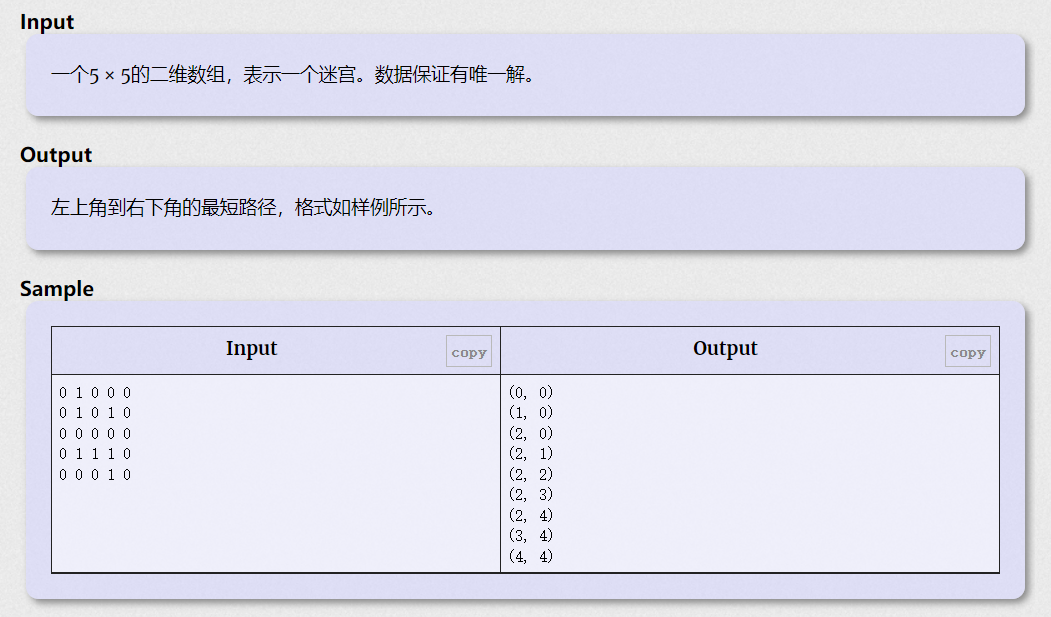 #include<iostream> #include<cstdio> #include<cstring> #include<queue> using namespace std; struct donut{ int x,y; }; int meme[5][5]; bool vis[5][5]; int dic[4][2]={1,0,-1,0,0,1,0,-1}; donut pre[10][10];\\pre[i][j]代表走到i,j位置前缀元素 queue<donut> hole; void print(donut cur) { if(cur.x==0&&cur.y==0) { printf("(0, 0)\n"); return; } print(pre[cur.x][cur.y]); printf("(%d, %d)\n",cur.x,cur.y);\\递归打印 } int main() { for(int i=0;i<5;i++) for(int j=0;j<5;j++) cin>>meme[i][j]; donut b;b.x=0,b.y=0;vis[0][0]=true; hole.push(b); while(!hole.empty()) { b=hole.front(); if(b.x==4&&b.y==4)\\搜索到就退出 break; hole.pop(); for(int i=0;i<4;i++) { donut m; m.x=b.x+dic[i][0];m.y=b.y+dic[i][1]; if(m.x>=0&&m.y>=0&&m.x<5&&m.y<5&&!vis[m.x][m.y]&&meme[m.x][m.y]==0) { vis[m.x][m.y]=true; pre[m.x][m.y]=b;\\pre[i][j]上表示前缀元素 hole.push(m); } } } b.x=b.y=4; print(b); return 0; }