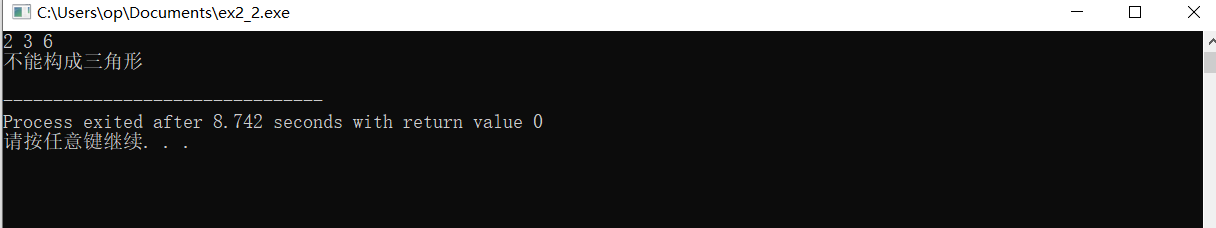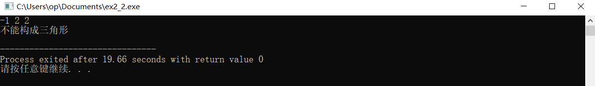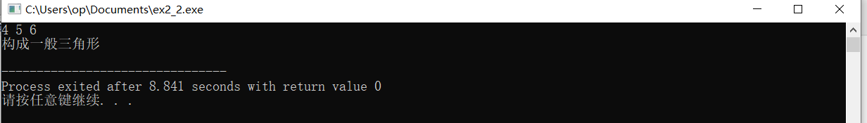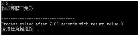 #include <stdio.h> int main() { double a, b, c; scanf("%lf %lf %lf", &a, &b, &c); if (a < 0 || b < 0 || c < 0) printf("不能构成三角形\n"); else if (a + b > c&& a + c > b&& b + c > a) { if (a == b && a == c||b==c){ if(a==b&&a==c) printf("构成等边三角形\n"); else printf("构成等腰三角形\n"); } else printf("构成一般三角形\n"); } else printf("不能构成三角形\n"); return 0; }