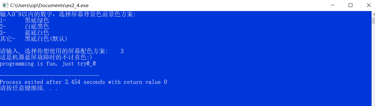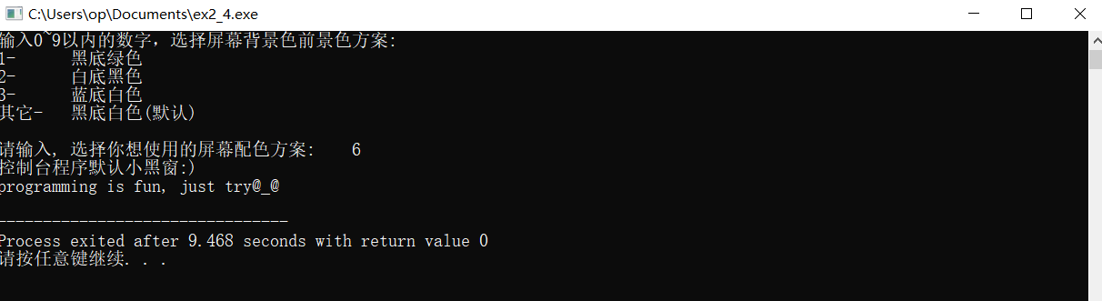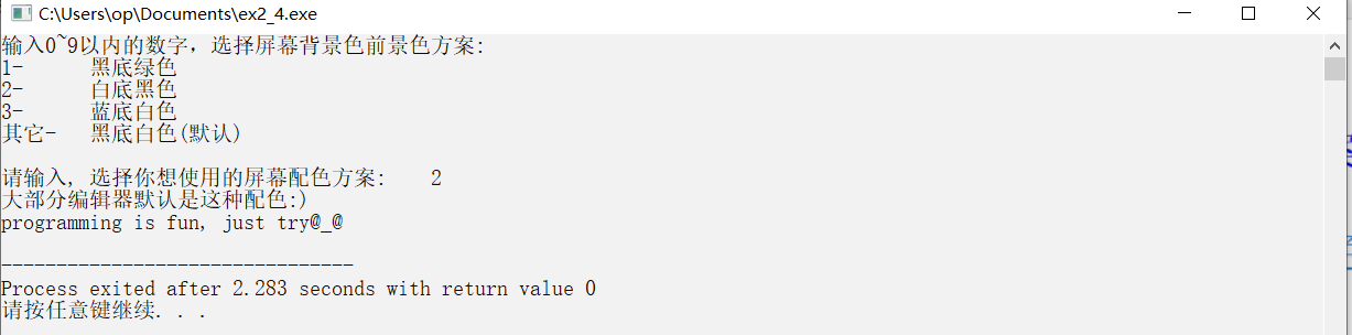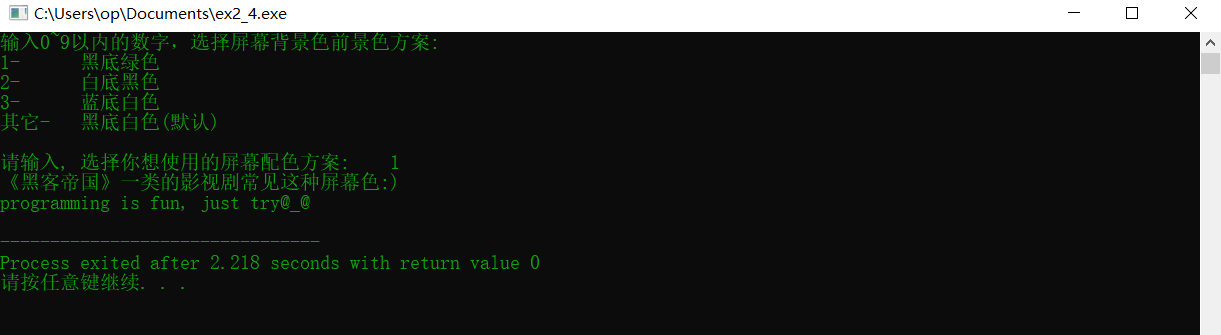 #include <stdio.h> #include <stdlib.h> int main() { int choice; // 显示菜单 printf("输入0~9以内的数字,选择屏幕背景色前景色方案: \n"); printf("1-\t黑底绿色\n"); printf("2-\t白底黑色\n"); printf("3-\t蓝底白色\n"); printf("其它-\t黑底白色(默认)\n"); printf("\n请输入, 选择你想使用的屏幕配色方案: "); // 要求用户从键盘输入0~9的数字,选择屏幕配色方案 scanf("%d",&choice); // 根据用户输入,设置屏幕配色方案 if (choice == 1) { system("color 02"); printf("《黑客帝国》一类的影视剧常见这种屏幕色:)\n"); } else if(choice == 2) { system("color f0"); printf("大部分编辑器默认是这种配色:)\n"); } else if(choice == 3) { system("color 1f"); printf("这是机器蓝屏故障时的不讨喜色:)\n"); } else { system("color 0f"); printf("控制台程序默认小黑窗:)\n"); } printf("programming is fun, just try@_@\n"); return 0; }