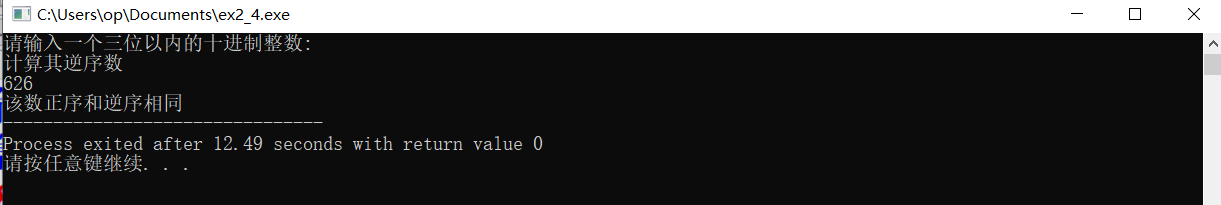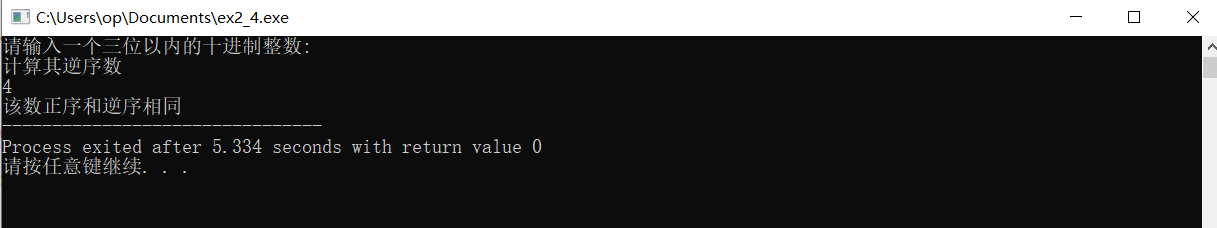 #include <stdio.h> int main(){ int x,y; printf("请输入一个三位以内的十进制整数:\n"); printf("计算其逆序数\n"); scanf("%d",&x); if (0<=x&&x<10) { printf("该数正序和逆序相同"); } else if(10<=x&&x<=999) { y=(x%10)*100+((x/10)%10)*10+x/100; if (x==y) printf("该数正序和逆序相同"); else printf("该数正序和逆序不同"); } else printf("wrong"); return 0; }