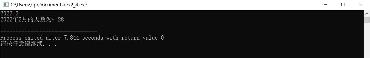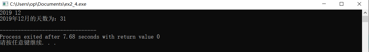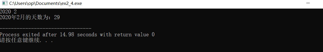 #include<stdio.h> #include<stdlib.h> int main() { int year,month,day,leapyear; scanf("%d%d",&year,&month); if(year<0||month<1||month>12) { printf("输入的数据错误!\n"); exit(0); } leapyear=year%4==0&&year%100!=0||year%400==0; if (month==1||month==3||month==5||month==7||month==8||month==10||month==12) { printf("%d年%d月的天数为:31\n",year,month); } else if(month==2) { day=28+leapyear; printf("%d年%d月的天数为:%d\n",year,month,day); } else { printf("%d年%d月的天数为:30\n",year,month); } return 0; }