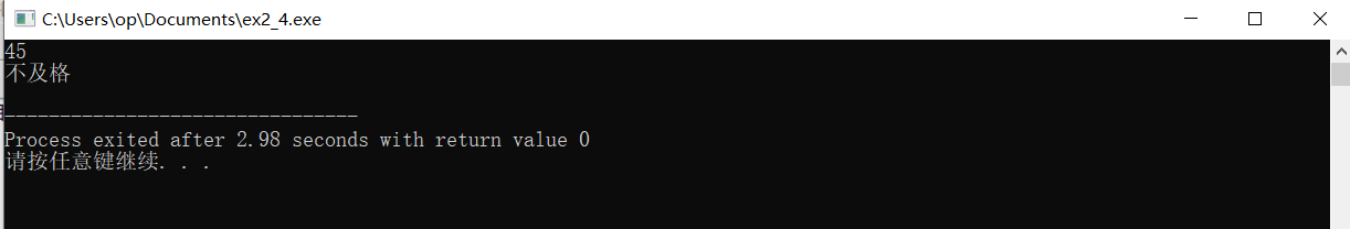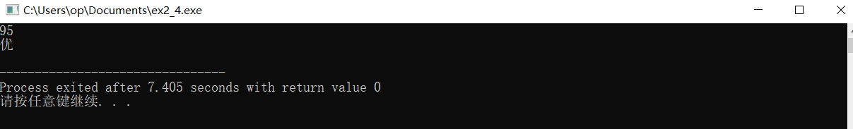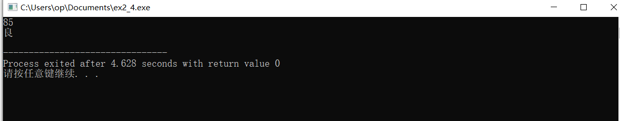 #include<stdio.h> #include<stdlib.h> int main() { int cj; scanf("%d",&cj); if(cj<0||cj>100) { printf("数据输入错误\n"); exit(0); } if(cj>=90&&cj<=100) printf("优\n"); else if(cj>=80&&cj<90) printf("良\n"); else if(cj>=70&&cj<80) printf("中\n"); else if(cj>=60&&cj<70) printf("及格\n"); else printf("不及格\n"); return 0; }