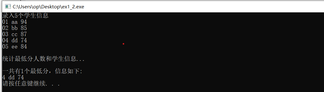 #include <stdio.h> #include <stdlib.h> const int N=5; // 定义结构体类型struct student,并定义STU为其别名 typedef struct student { long no; char name[20]; int score; }STU; // 函数声明 void input(STU s[], int n); int findMinlist(STU s[], STU t[], int n); void output(STU s[], int n); int main() { STU stu[N], minlist[N]; int count; printf("录入%d个学生信息\n", N); input(stu, N); printf("\n统计最低分人数和学生信息...\n"); count = findMinlist(stu, minlist, N); printf("\n一共有%d个最低分,信息如下:\n", count); output(minlist, count); system("pause"); return 0; } // 输入n个学生信息,存放在结构体数组s中 void input(STU s[], int n) { int i; for(i=0; i<n; i++) scanf("%ld %s %d", &s[i].no, s[i].name, &s[i].score); } // 输出结构体s中n个元素信息 void output(STU s[], int n) { int i; for(i=0; i<n; i++) printf("%ld %s %d\n", s[i].no, s[i].name, s[i].score); } // 在结构体数组s中,查找最低分学生的记录,将其存入结构体数组s中 // 形参n是结构体数组s中元素个数 // 函数返回最低分的学生人数 int findMinlist(STU s[], STU t[], int n) { // 补足函数实现 // ××× int i,min,number=0; min=s[0].score; for(i=0;i<n;i++) { if(s[i].score<min) { min=s[i].score; } } for(i=0;i<n;i++) { if(s[i].score==min) t[number++]=s[i]; } return number; }