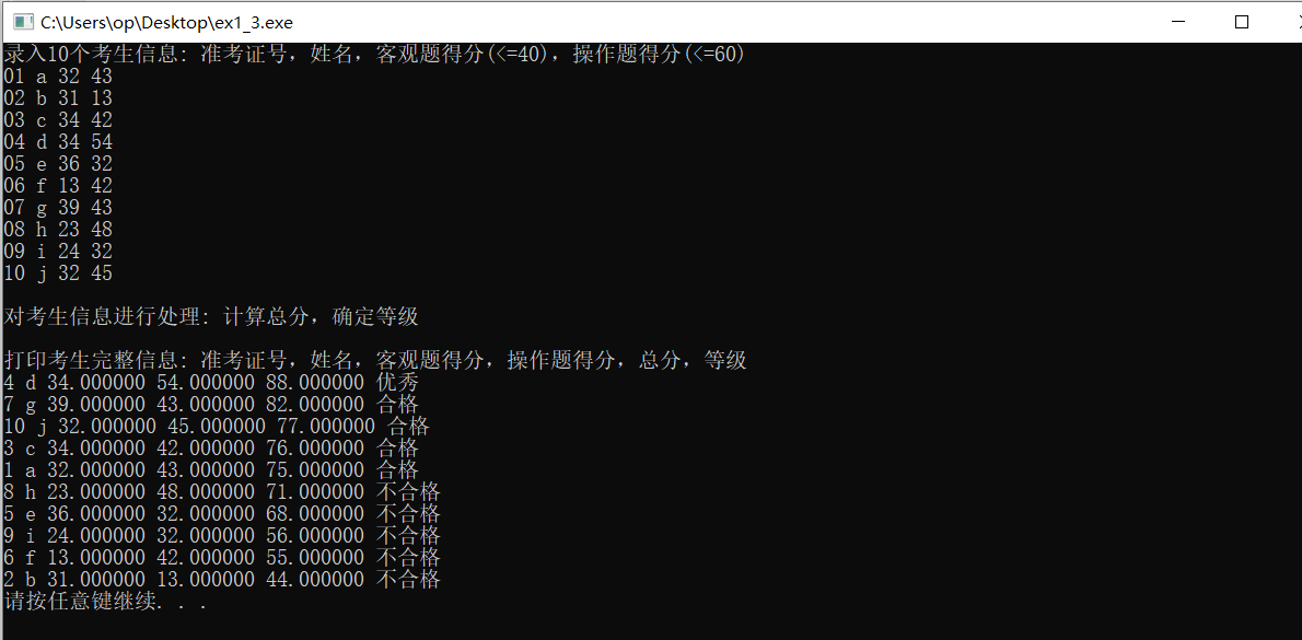 #include <stdio.h> #include <stdlib.h> #include <string.h> const int N = 10; // 定义结构体类型struct student,并定义其别名为STU typedef struct student { long int id; char name[20]; float objective; /*客观题得分*/ float subjective; /*操作题得分*/ float sum; char level[10]; }STU; // 函数声明 void input(STU s[], int n); void output(STU s[], int n); void process(STU s[], int n); int main() { STU stu[N]; printf("录入%d个考生信息: 准考证号,姓名,客观题得分(<=40),操作题得分(<=60)\n", N); input(stu, N); printf("\n对考生信息进行处理: 计算总分,确定等级\n"); process(stu, N); printf("\n打印考生完整信息: 准考证号,姓名,客观题得分,操作题得分,总分,等级\n"); output(stu, N); system("pause"); return 0; } // 录入考生信息:准考证号,姓名,客观题得分,操作题得分 void input(STU s[], int n) { // 补足代码 // ××× int i; for(i=0;i<n;i++) scanf("%d %s %f %f",&s[i].id,s[i].name,&s[i].objective,&s[i].subjective); } //输出考生完整信息: 准考证号,姓名,客观题得分,操作题得分,总分,等级 void output(STU s[], int n) { // 补足代码 // ××× int i; for(i=0;i<n;i++) printf("%d %s %f %f %f %s\n",s[i].id,s[i].name,s[i].objective,s[i].subjective,s[i].sum,s[i].level); } // 对考生信息进行处理:计算总分,排序,确定等级 void process(STU s[], int n) { // 补足代码 // ××× int i,j; for(i=0;i<n;i++) { s[i].sum=s[i].objective+s[i].subjective; } student temp; for(i=0;i<N-1;i++) for(j=0;j<N-i-1;j++) if(s[j].sum<s[j+1].sum) { temp=s[j]; s[j]=s[j+1]; s[j+1]=temp; } strcpy(s[0].level,"优秀"); for(i=1;i<=4;i++) strcpy(s[i].level,"合格"); for(i=5;i<N;i++) strcpy(s[i].level,"不合格"); }