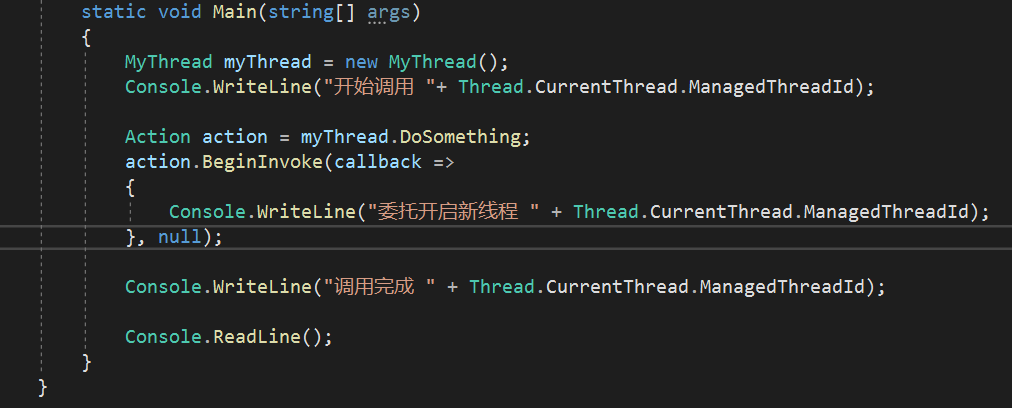 使用委托中的BeginInvoke方法执行委托,放进委托中的方法将在子线程中执行,委托执行完毕后的回调方法也在子线线程中执行。